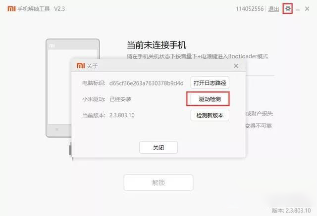 1.5->>点击右上角【设置】图标,点击检测,检测电脑是否安装了小米驱动,没有的话点击安装即可。
